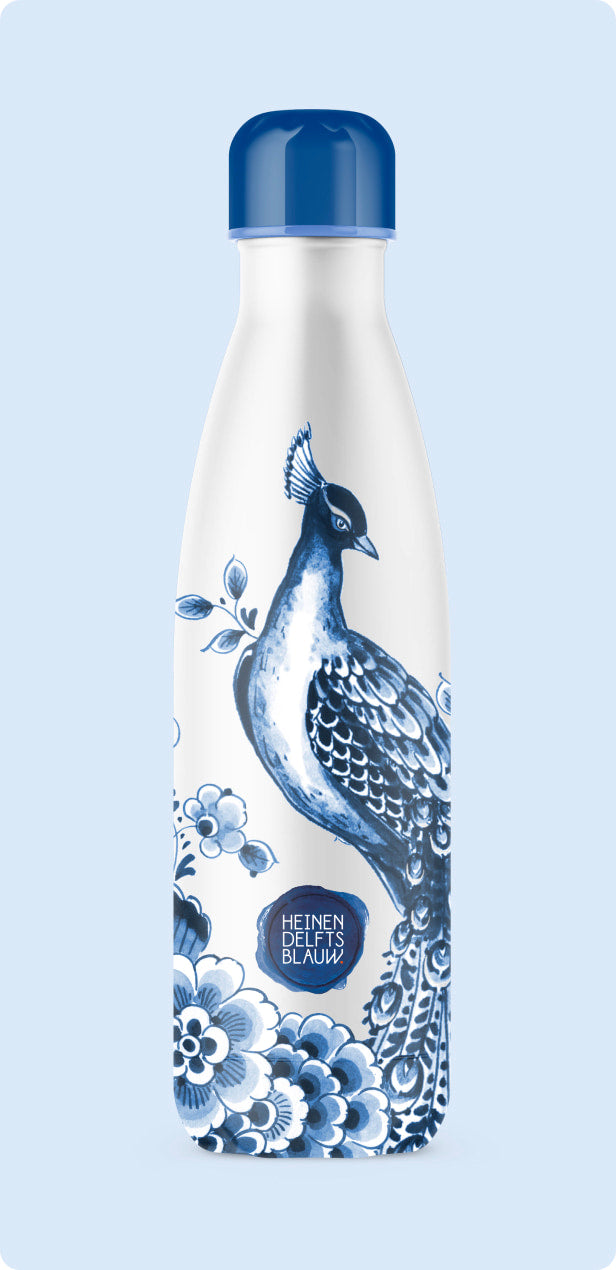 IZY en Heinen Delfts Blauw bundelen de krachten in een unieke collectie flessen. Geïnspireerd op de rijke traditie van Delfts Blauw, brengt de stijlvolle Peacock-fles een stukje Nederlandse kunst in je dagelijks leven. Geniet van je favoriete warme of koude drankje in een fles die historie, elegantie én herbruikbaarheid combineert.