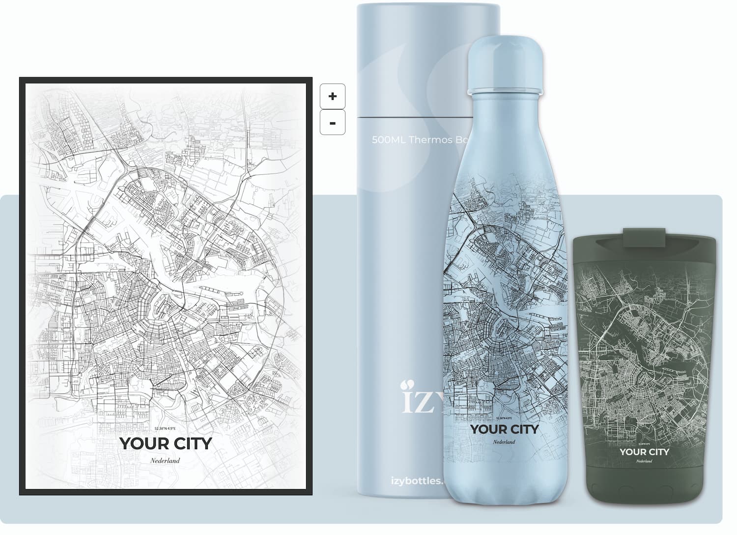 Maak je eigen unieke statement met onze 'IZY x Jouw Stad' service. Deze op maat gemaakte service biedt jou de kans om de liefde voor jouw stad of een speciale plek te vereeuwigen op een hoogwaardige thermosfles of mok.