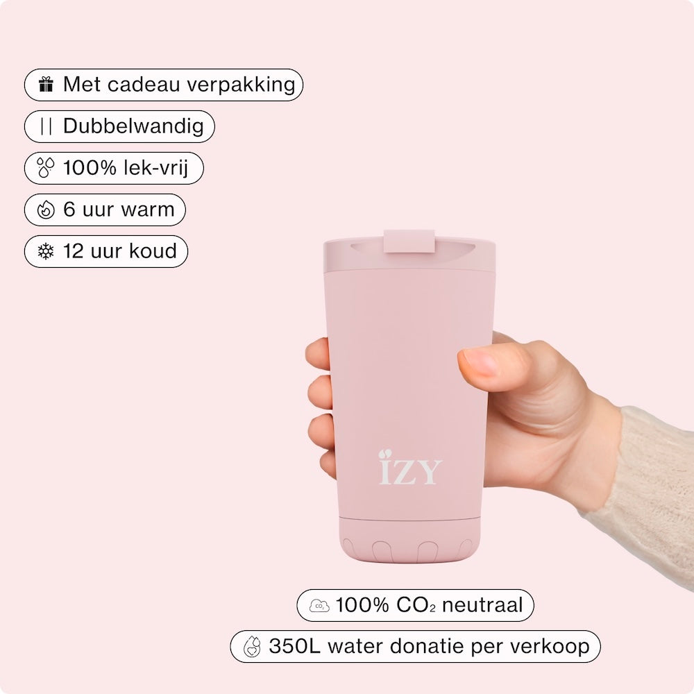 Of je nu een wandeling maakt, een dagje onderweg bent of gewoon een moment voor jezelf neemt: met de IZY Mugs x Roze kan je zorgeloos en langer genieten van je warme drankje als koffie of thee – duurzaam, stijlvol en op temperatuur.