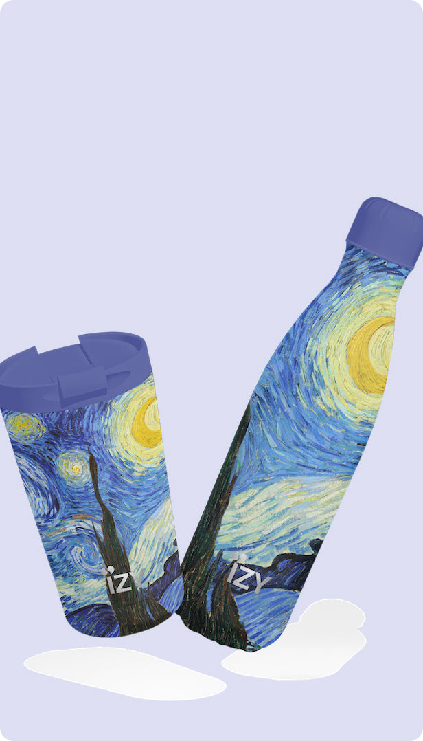 Laat je meevoeren door de magie van Van Goghs Starry Night. Deze exclusieve IZY bundle bestaat uit een dubbelwandige thermosfles (500 ml) en een thermosmug (350 ml), beide bedrukt met het betoverende sterrennacht-design. Ideaal om je drank 24 uur ijskoud of 12 uur heerlijk warm te bewaren – thuis, op kantoor of onderweg.